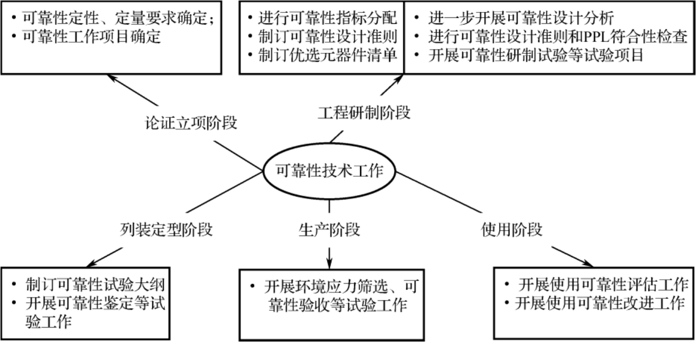 可靠性技术工作包括可靠性论证、分析、设计、试验、评价,生产过程的可靠性控制,以及使用和维护阶段的可靠性数据收集、处理和评估等技术工作。在不同寿命周期阶段,装备研制所要开展的可靠性技术工作各有侧重。