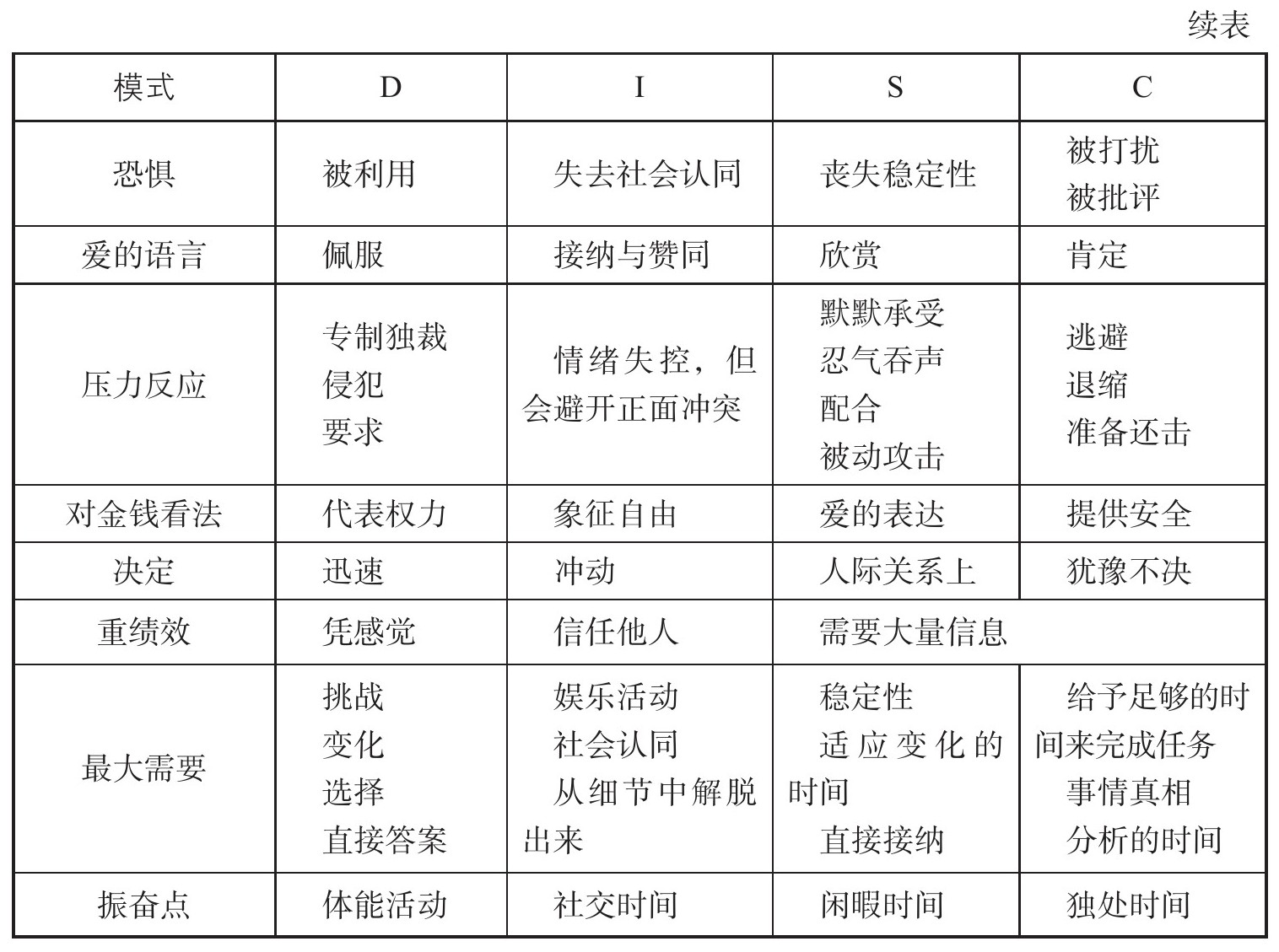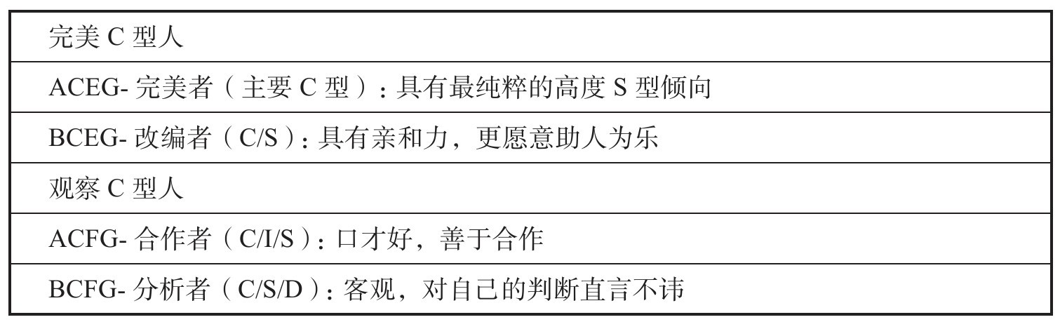 具有这种行为模式的人,追求质量,看重秩序,服从权威,遵守规则。做事讲究有条有理,重视细节。他们喜欢与讲究产品(或服务)质量的团队一起工作(见表4)。