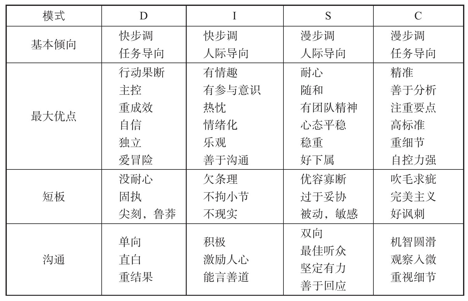 DISC四种模式的人具有与生俱来、差异互补的个性特点,这些特点是区别四型人的主要因素(见表5)。