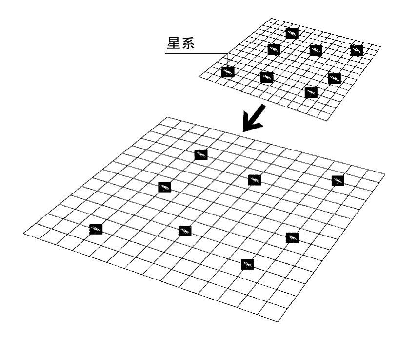 如果想象不出这一情况,那么可以尝试在脑海中想象一个可以自由伸缩的橡胶围棋棋盘。围棋棋盘相当于宇宙,棋盘上的交叉点相当于各个星系。如果拉拽棋盘的四角让棋盘“膨胀”,那么棋盘上星系与星系之间的距离就会变大。虽然不管从哪个星系的角度去观察,其他星系看上去都在远离,但是宇宙中并不存在这种“中心”位置。粗略来看,宇宙的膨胀情况与拉拽橡胶围棋棋盘的情况类似。