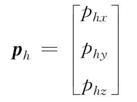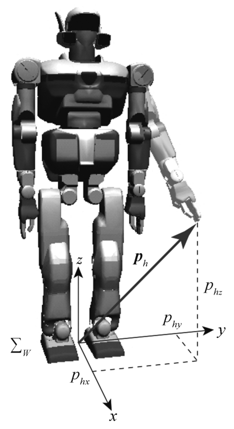 图2.2 世界坐标系。将初始状态的人形机器人正下方作为原点。在世界坐标系里用 p h 表示指尖位置