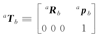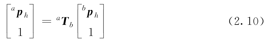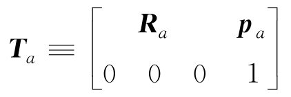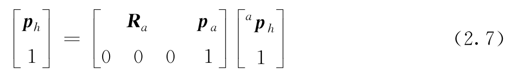 这里为了使矩阵计算前后一致,使结果与式(2.6)相同,适当地在向量和矩阵中追加了0和1。右边出现的4×4矩阵将手臂的位置和( p a , R a )整合在一起。这里可以写为