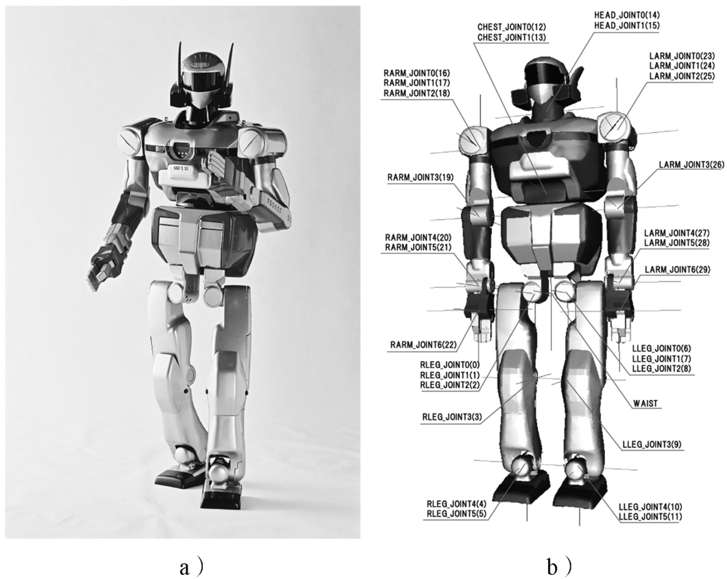 人形机器人HRP-2 [128] (见图2.1a)身高154cm,搭载电池时体重为58kg,依靠电池可行走约1 h。HRP-2共有30个关节,每个关节都可以独立控制。图2.1b展示出了它的所有关节的名称和坐标轴。