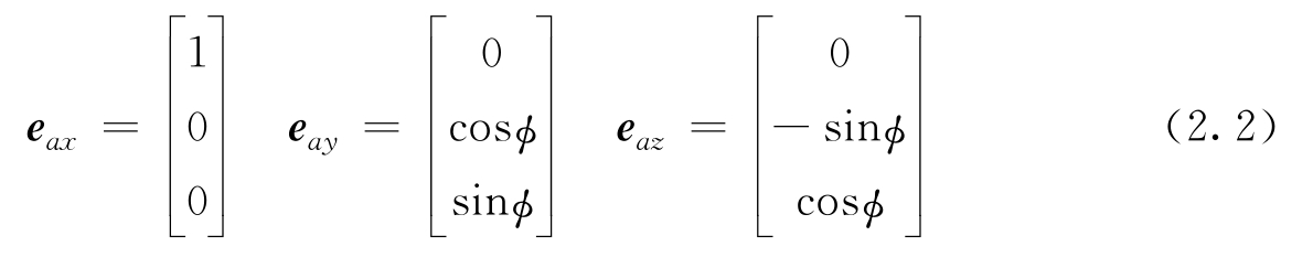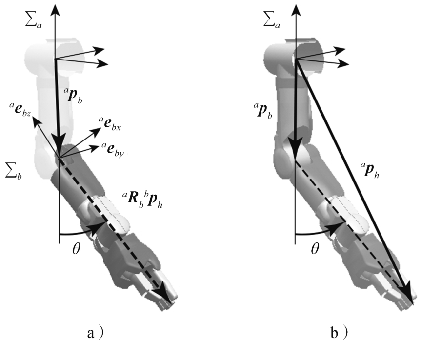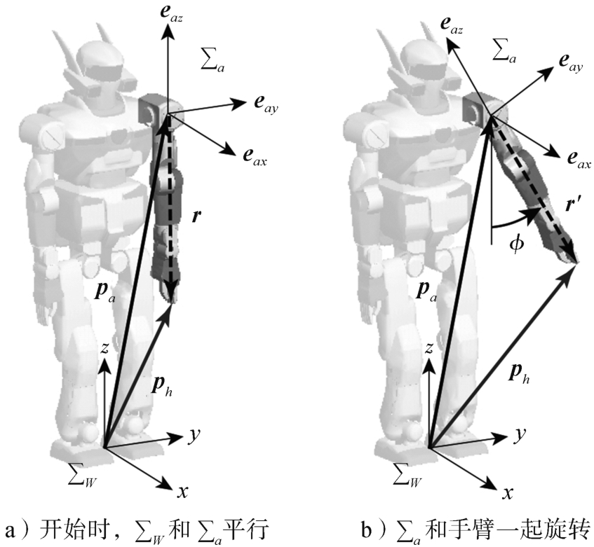 Σ a 是根据肩膀上设定的原点和 x 、 y 、 z 轴的单位向量组成。三个单位向量 e ax , e ay , e az 在手臂放下的初期姿态与Σ W 平行(见图2.3a)。一旦机器人手臂抬起,Σ a 就会以 e ax 轴为中心旋转,旋转角度为 ϕ (见图2.3b)。