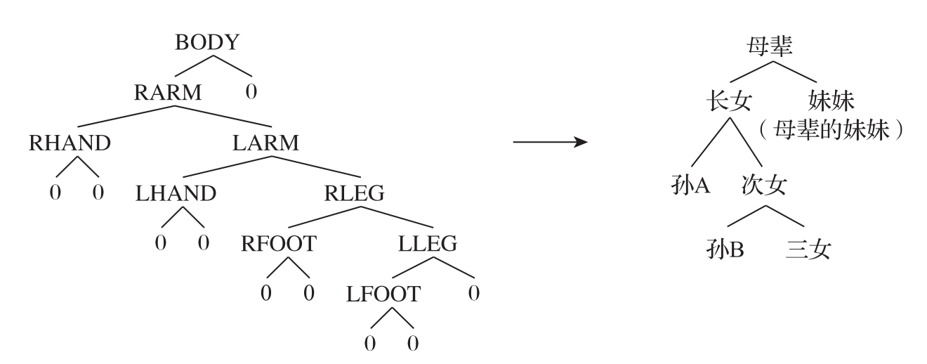 因此,试着将同样的家族关系用图2.16的方式重新表达。每个连杆必须有两支,左下支记“子(孩子即子项)”,右下支记为“妹(妹妹)” [10] 。例如,RARM的右下分支LARM、RLEG、LLEG就是它的妹妹。RARM的母辈是右上的BODY,它的直系子项是左下的RHAND。也就是说,它们表示了表面上不同但实际上与图2.15完全相同的连杆之间的家族关系。另外,不存在“子”和“妹”的分支记为“0”。