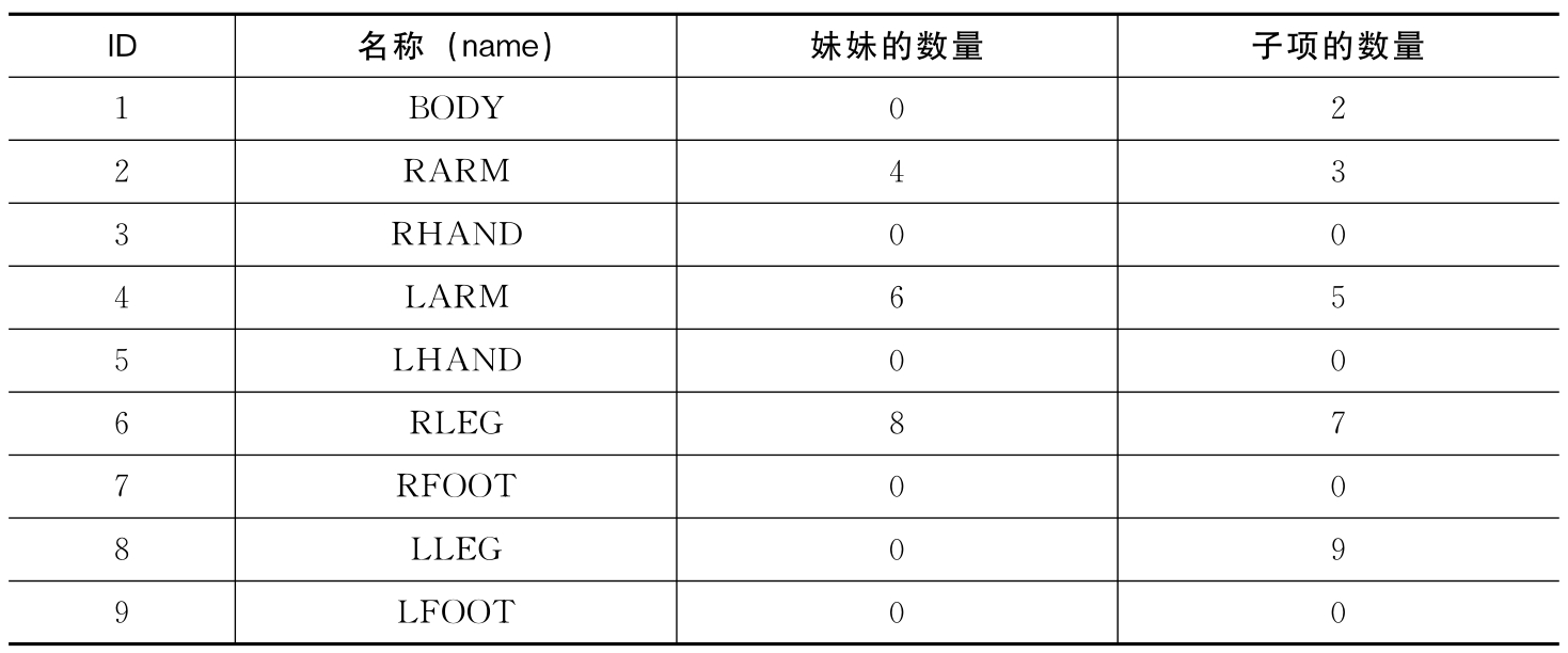 接下来考虑如何在实际的计算机程序中处理这些信息。将图2.16转化为表2.2。为了唯一地指定连杆,将BODY的ID设为1,其余按逻辑关系的顺序进行编号。