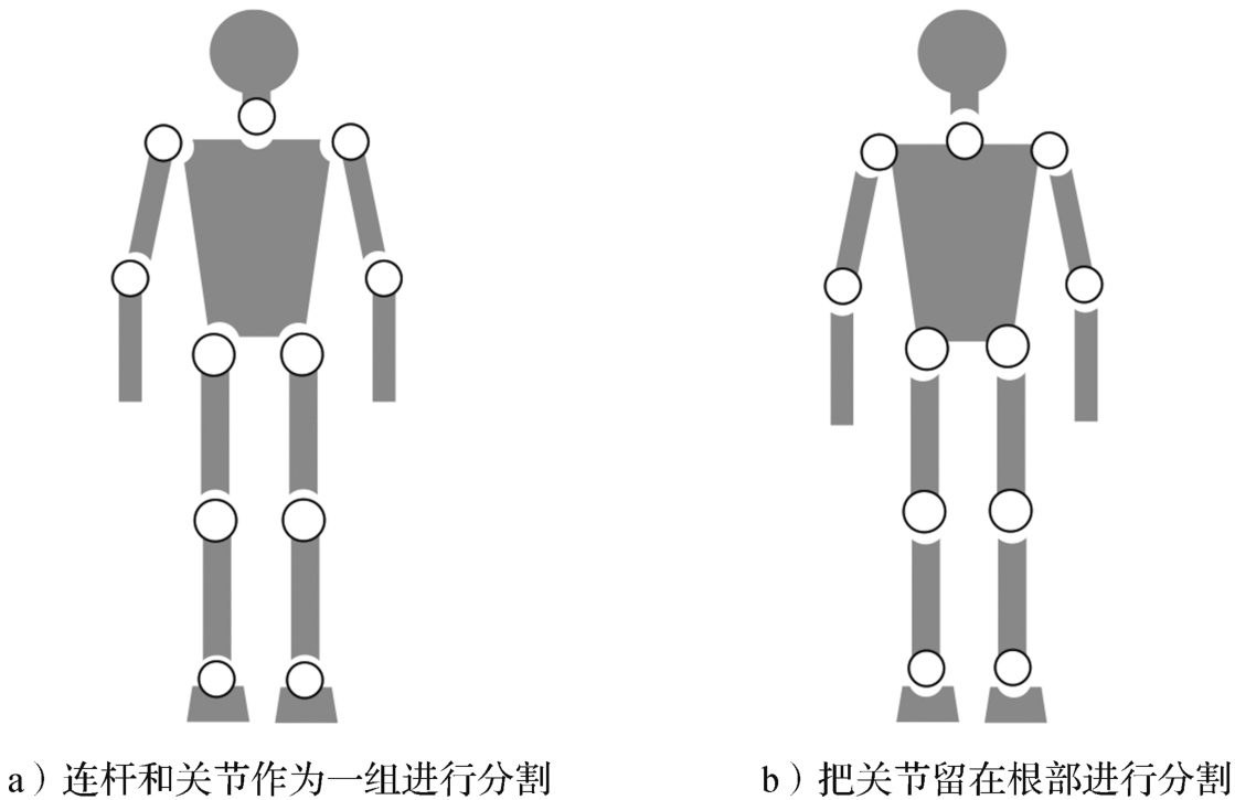 人形机器人是由许多连杆通过关节连接而成的机器人,因此分析的第一步是将机器人按照关节和连杆进行分割。图2.14给出了两种分割方法。