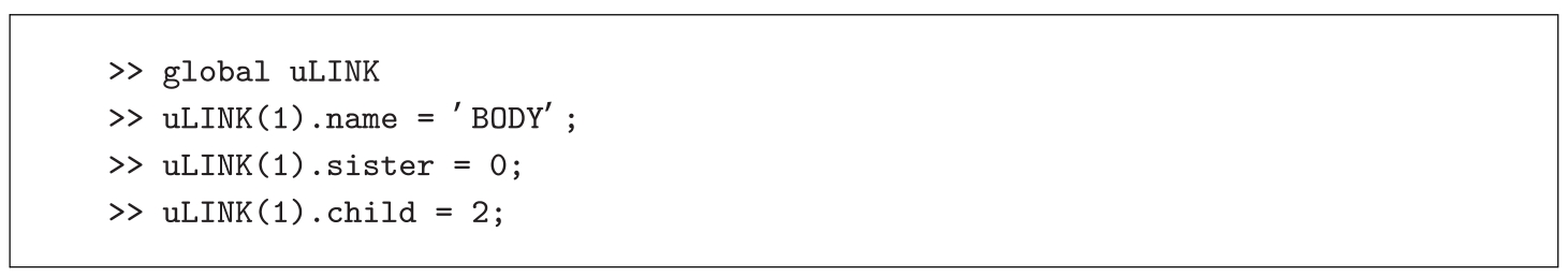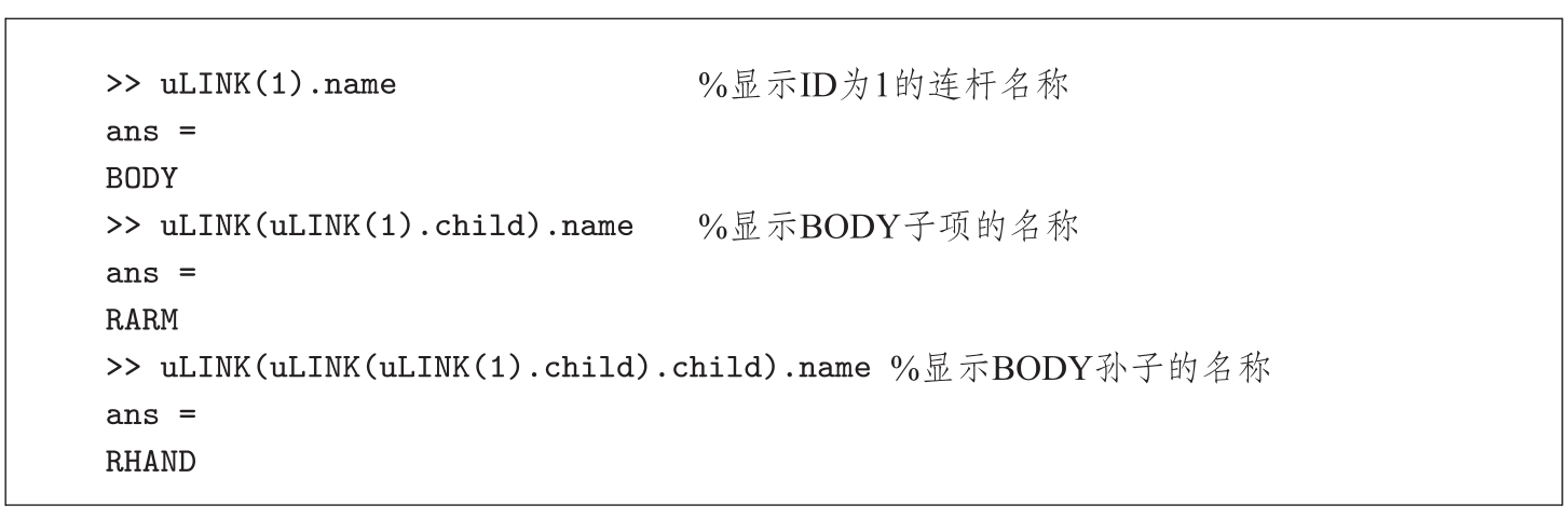≫是Matlab的命令提示。uLINK是本书使用的结构序列的名称,大部分数据都存储在这里。在第一行中,uLINK被声明为全局变量,从而可以在其余程序中调用。uLINK(1)表示与ID为1的连杆相对应,用句号点隔开,指定数据字段(name, sister, child)并代入值。