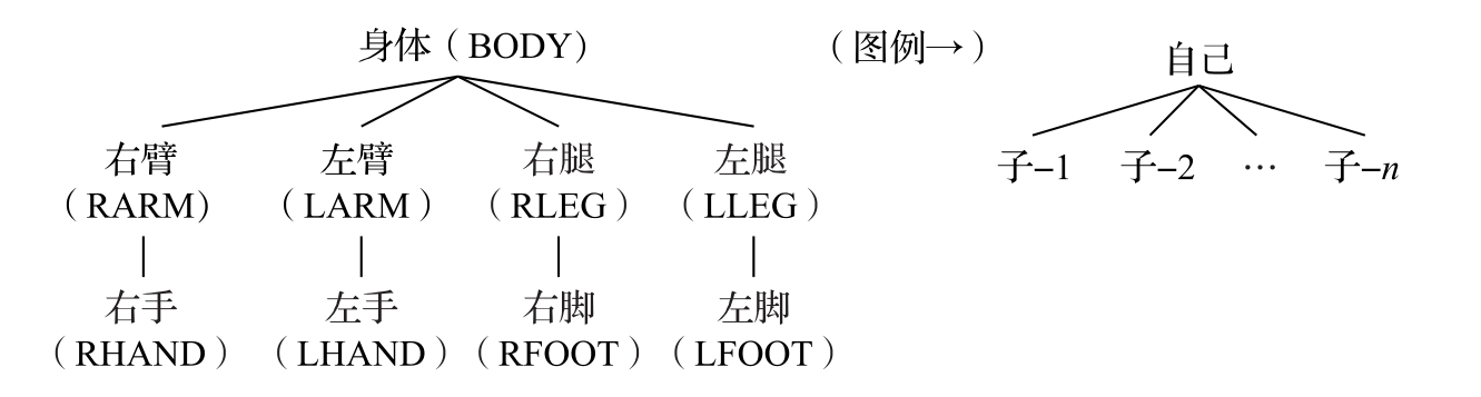 将这样分割的连杆正确地连接在一起,就能再现人形机器人的构造。连杆之间的连接关系可以用图2.15的树状结构 [9] 来表示。或者也可以把连杆的连接关系比喻成以身体为始祖的家谱,认为其后代沿着远离身体的方向相连。