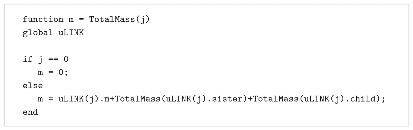 使用递归调用的技巧,可以简单地编写求出总连杆质量的程序(见图2.18)。预先在uLINK中追加m这一数据字段来设置各连杆的质量。