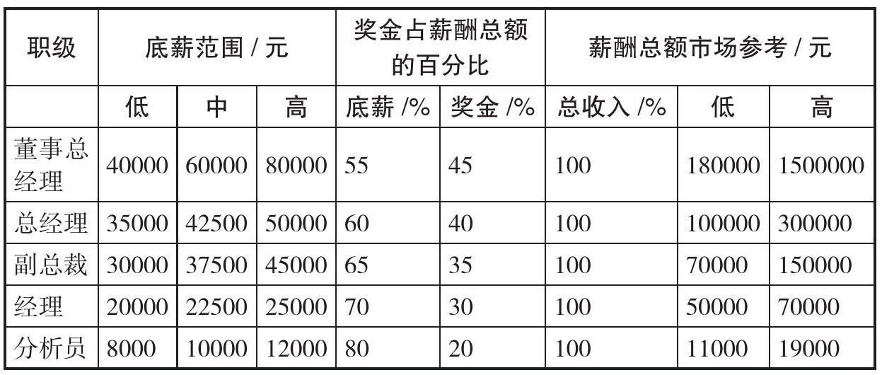 我加入中金前,在快消品行业工作。当时业界流行的薪酬激励方案基本都是基于销售成本理论(cost of sales),说白了就是“底薪+销售提成”,底薪跟职级挂钩,提成系数是销售业绩的某个百分点。当时,我还没有投资银行行业的工作经验。加入中金后,经过几个月对投行特点的学习、调研和思考,结合当时非常流行的3P薪酬模型,即所谓的因人支付薪酬(pay for people)、因岗支付薪酬(pay for position)和因绩效支付薪酬(pay for performance)理论,我拿出了中金公司的第一套所谓的统一方法论的薪酬方案(见表1-1)。