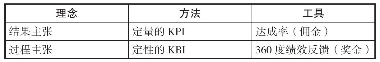 如果公司选择了过程主张的激励考核理念,就要花时间思考和设计考核方法和工具。过程主张是以每一位员工达成业绩的能力论英雄,考核方法是通过高度描述化的关键行为指标(KBI)来发现员工的能力,工具就是360度绩效反馈。试想,如果没有360度绩效反馈这个考核工具的发明和运用,过程主张的考核理念即使再先进也很难落地。本书会在后面详细讨论如何成功地落地360度绩效反馈工具。