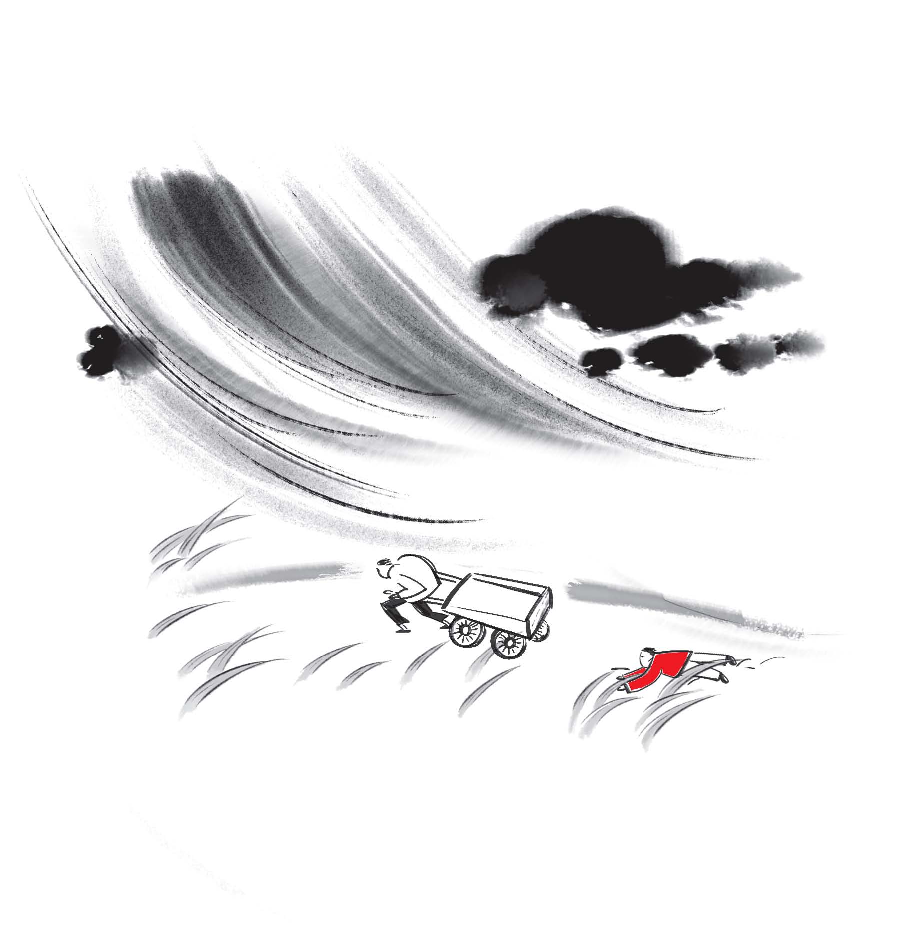 “一个人”是我爷爷。小的时候,我跟着爷爷去荒草甸子里割草。归程时天象诡异,一根飞速旋转着的黑色的圆柱向我们逼过来,并且伴随着沉闷如雷鸣的呼隆声。我惊问爷爷,那是什么?爷爷淡淡地说,风,使劲拉车吧,孩子。风越来越大。我们车上的草被刮到天上去,我被风刮倒在地,双手死死地抓住了两丛根系很深的牛筋草才没有被风刮走。我看到爷爷双手攥着车把,脊背绷得像一张弓,他的双腿在颤抖,小褂子被风撕破,只剩下两个袖子挂在肩上。爷爷与大风对抗着,车子未能前进,但也没有后退半步。大风过去了,爷爷还保持着这个姿势,仿佛一尊雕塑。许久之后,他才慢慢地直起腰,他的手指蜷曲着都伸不开了。爷爷与狂风对峙的模样,永远印刻在我的脑海里。那么我们是胜利者还是失败者?风来时,爷爷没有躲避,尽管风把我们车上的草刮得只剩下一棵,我们的车还在,我们就像钉在大坝上一样,没有前进,但是也没有倒退。我觉得从这个意义来讲,我们胜利了。