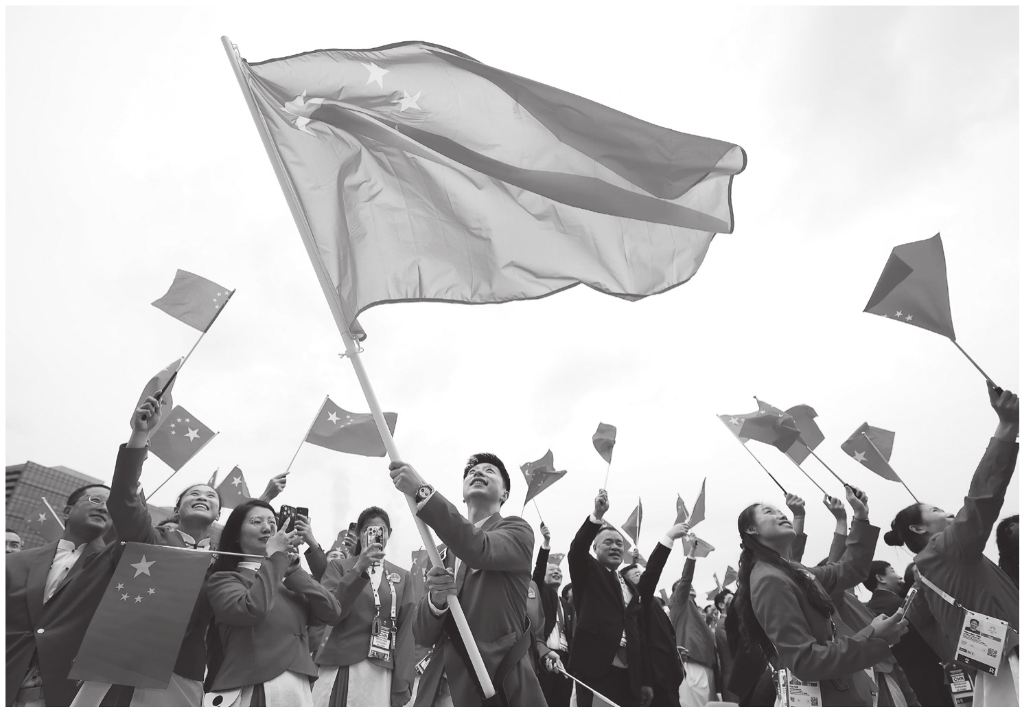 ★ 2024年7月26日,在法国巴黎举行的第33届夏季奥林匹克运动会开幕式正式开始前,中国体育代表团旗手挥舞国旗。(新华社记者曹灿摄)