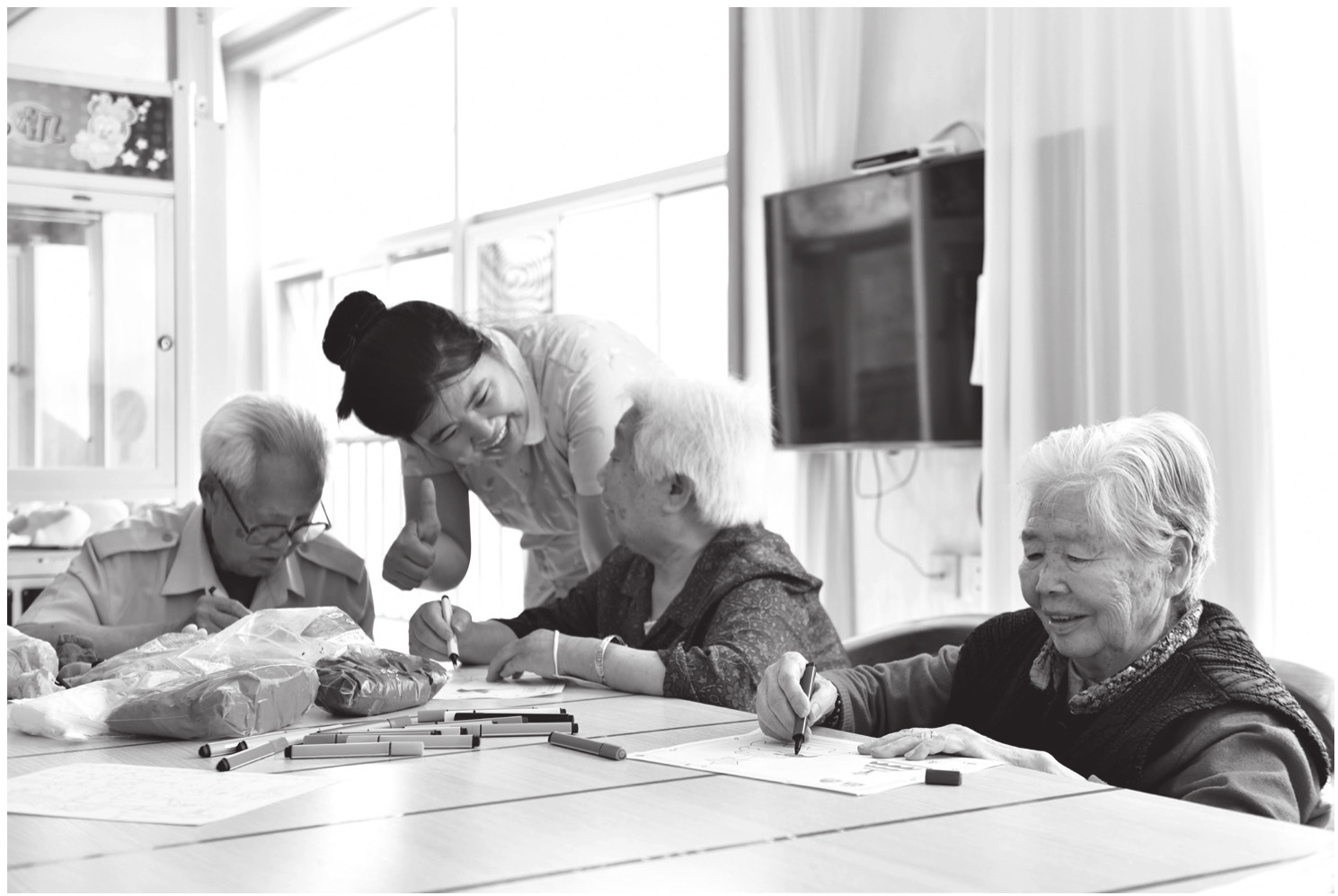 ★ 2024年5月25日,在山东省日照市东港区石臼街道日照幸福护理院,老人在工作人员的陪护下做填图游戏。(新华社记者郭绪雷摄)