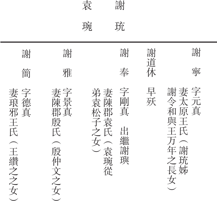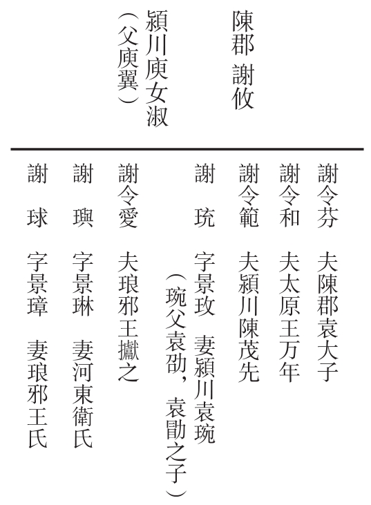 墓誌不僅載明謝弈八子和謝攸三子的名諱、官位,還載明各自妻族的郡望,只是不録這些妻子的名諱及其父名,而謝弈三女及謝攸四女則詳載其夫婿姓名郡望。可是,對墓主謝珫夫妻子女社會關係的記録就詳細得多,諸子的妻族都寫上父名。
