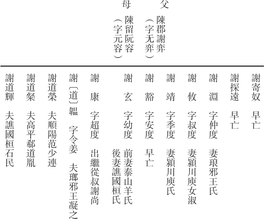 墓誌詳述陳郡謝氏謝弈子謝攸一支,爲歷來各種史料所未備。案《晋書》卷七九《謝弈傳》,只説弈有三子:泉(淵)、靖、玄。同書同卷《謝尚傳》,稱尚“無子,從弟弈以子康襲爵,早卒”。同書同卷《謝玄傳》載玄上疏,自稱“臣同生七人,凋落相繼,惟臣一己,孑然獨存”。是文獻中謝弈子存名者四人。而謝珫墓誌叙弈子凡八人:寄奴、探遠、淵(字仲度)、攸(字叔度)、靖(字季度)、豁(字安度)、玄(字幼度)、康(字超度)。謝淵、謝攸、謝靖三人的字顯示,寄奴和探遠二人之中,必有一人夭亡過早,所以没有被計入兄弟排行中,正合於謝玄所謂“同生七人”。