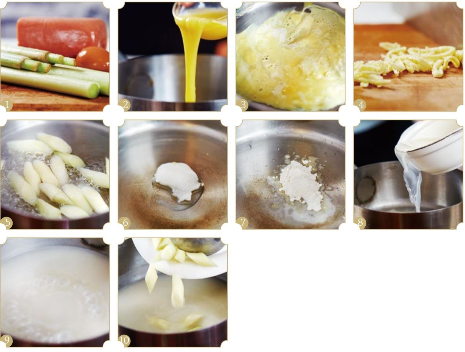 5. 下入蒲菜段、熟火腿条熬制一会儿,出锅后放入蛋皮丝即可。(图10)