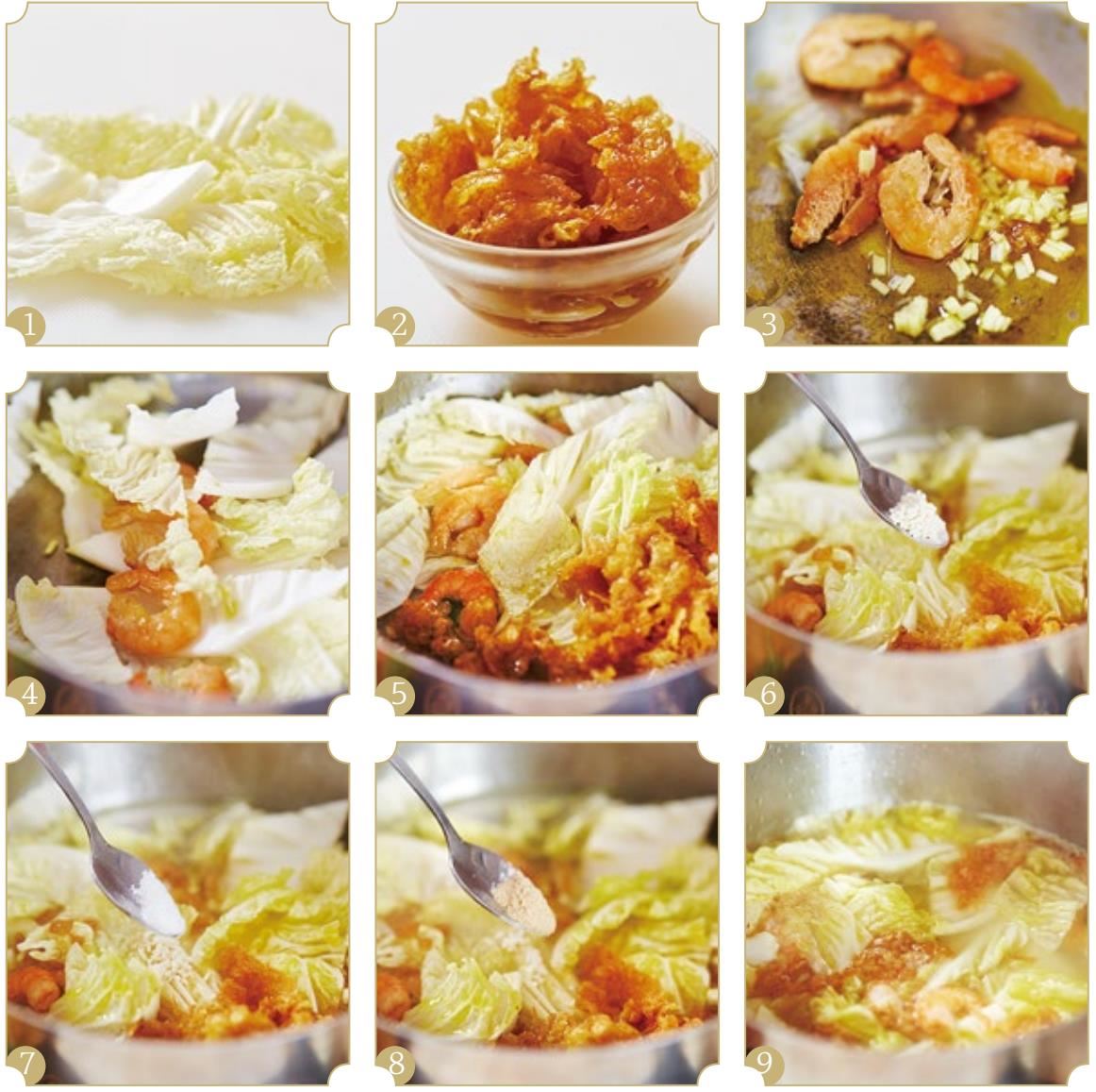 1. 将各种材料准备好。锅中加入花生油,烧热,加入蒜片、葱花爆锅,下入海米炒出香味,下入白菜片煸炒到断生,加入泉水和剩余的调料,炖至入味。(图1~图8)