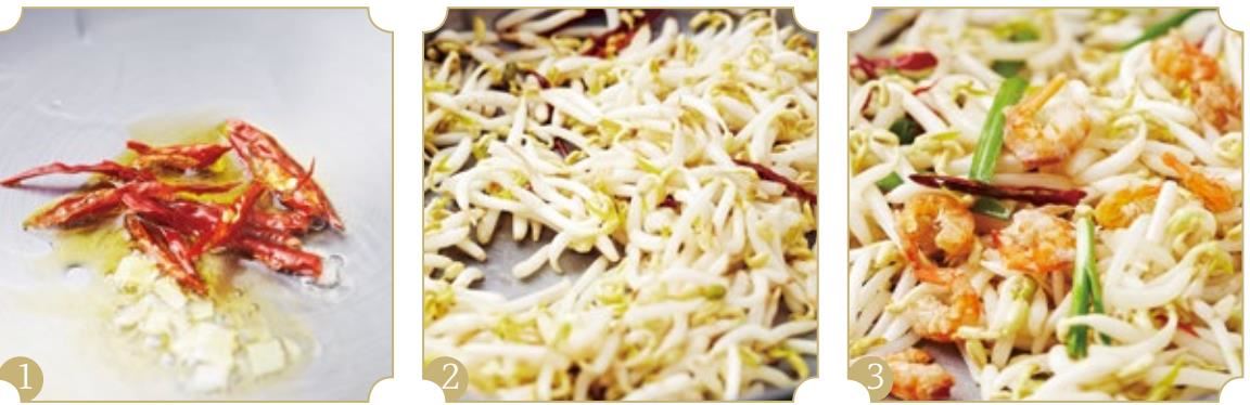 2. 锅中放入花生油,烧热,下入干辣椒丝、葱花煸炒,下入海米炒出香味,倒入绿豆芽,加入剩余的调料,加入韭菜段,大火快炒即成。(图1~图4)