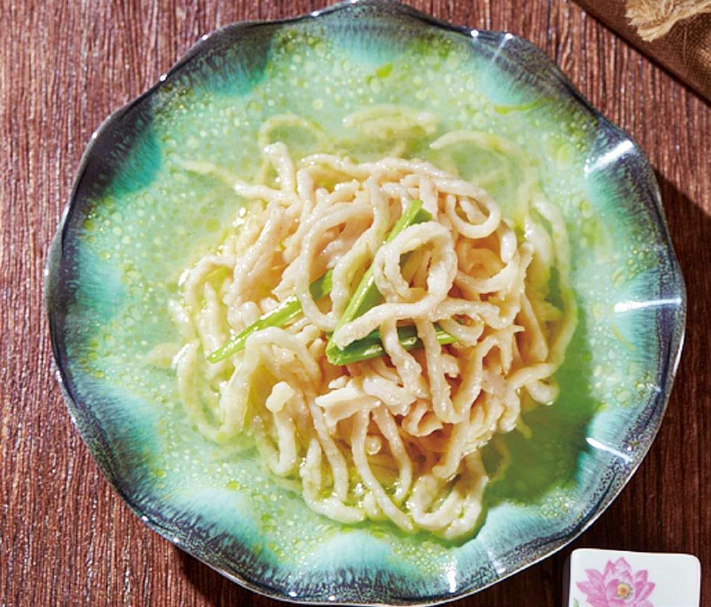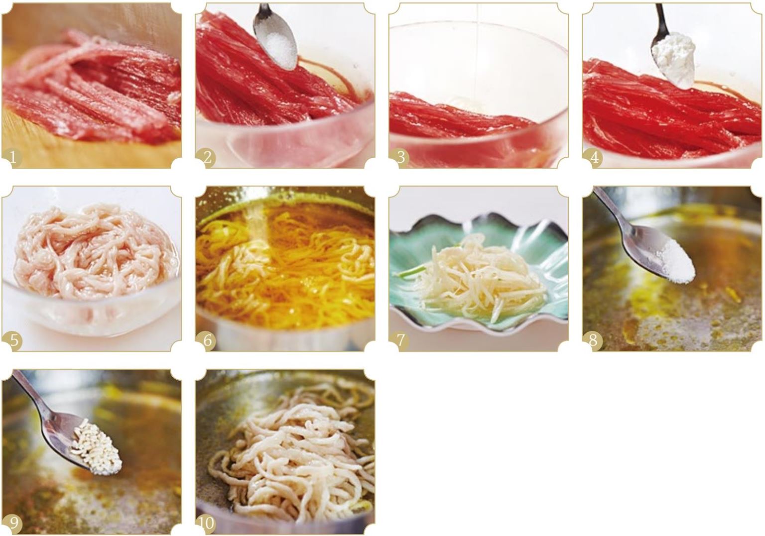 把里脊肉放在0℃的环境中冻至刚刚硬挺的状态,更容易切片。里脊丝要大小均匀,在抓拌上浆时要均匀有力,否则容易脱浆进而影响里脊丝的嫩度。滑油时,用的油量是里脊丝体积的3倍。