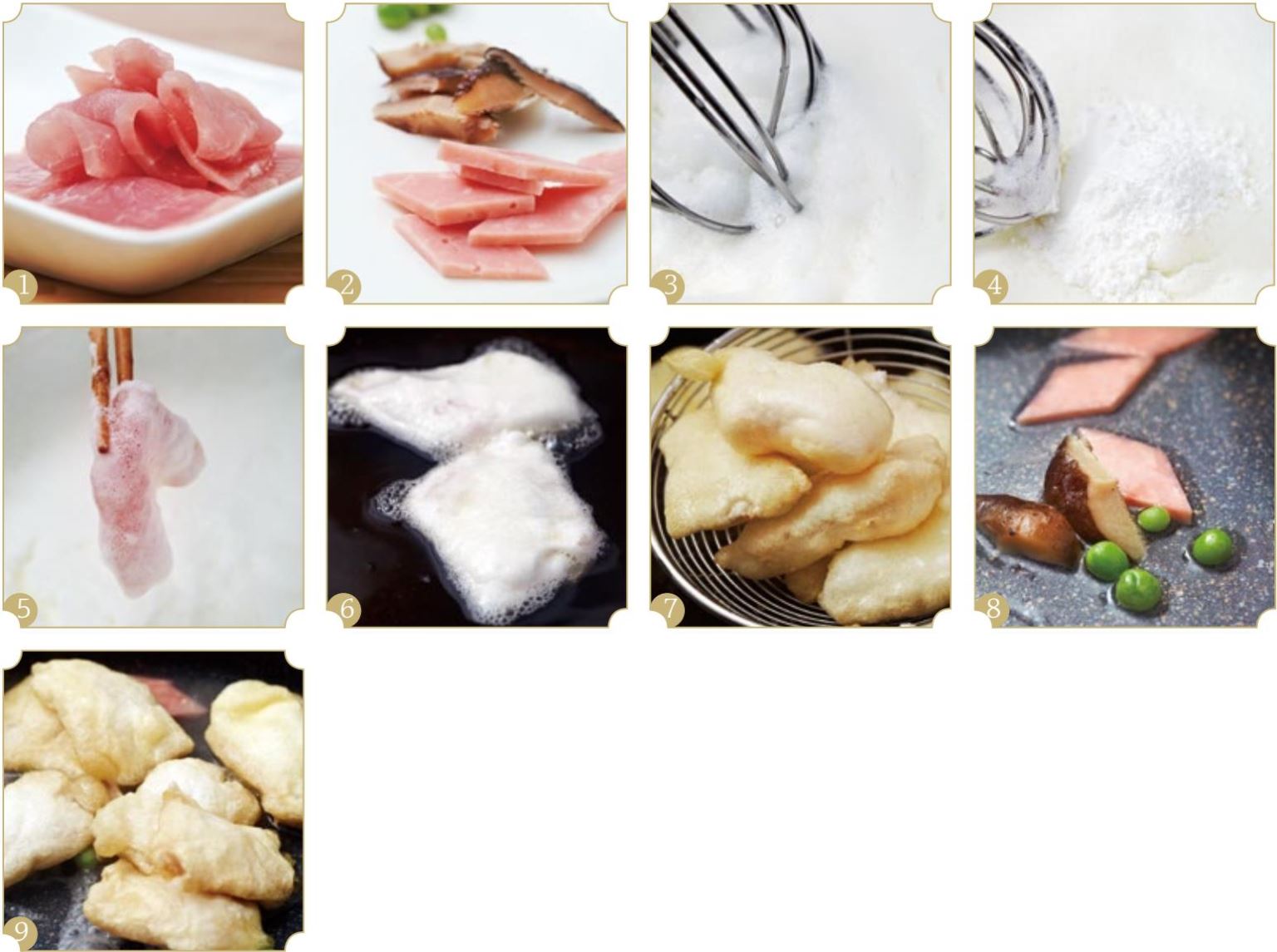 5. 净锅内加植物油,烧热,放入葱花、料酒,再放入香菇片、火腿片和青豆炒熟,加明油,放入炸好的里脊肉片和高汤、盐、鸡精,翻匀出锅即可。(图8~图9)