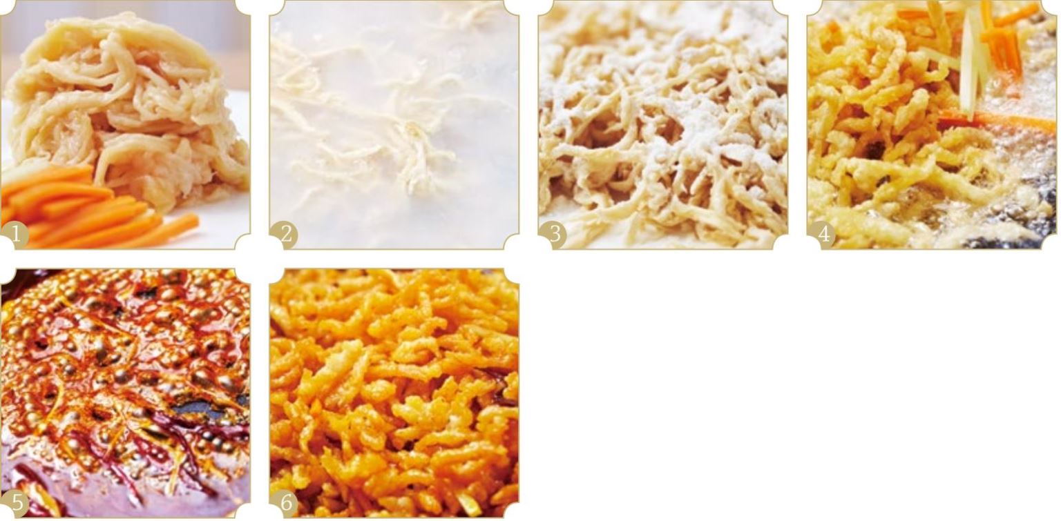 3. 锅内加入适量油,烧至五成热时,加入拍好粉的肉丝炸至酥脆,放入西芹丝、胡萝卜丝略炸。(图4)