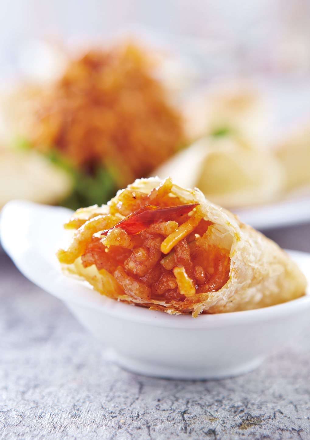 2. 将鸡肉丝汆水,捞出沥干后拍面粉备用。(图2~图3)