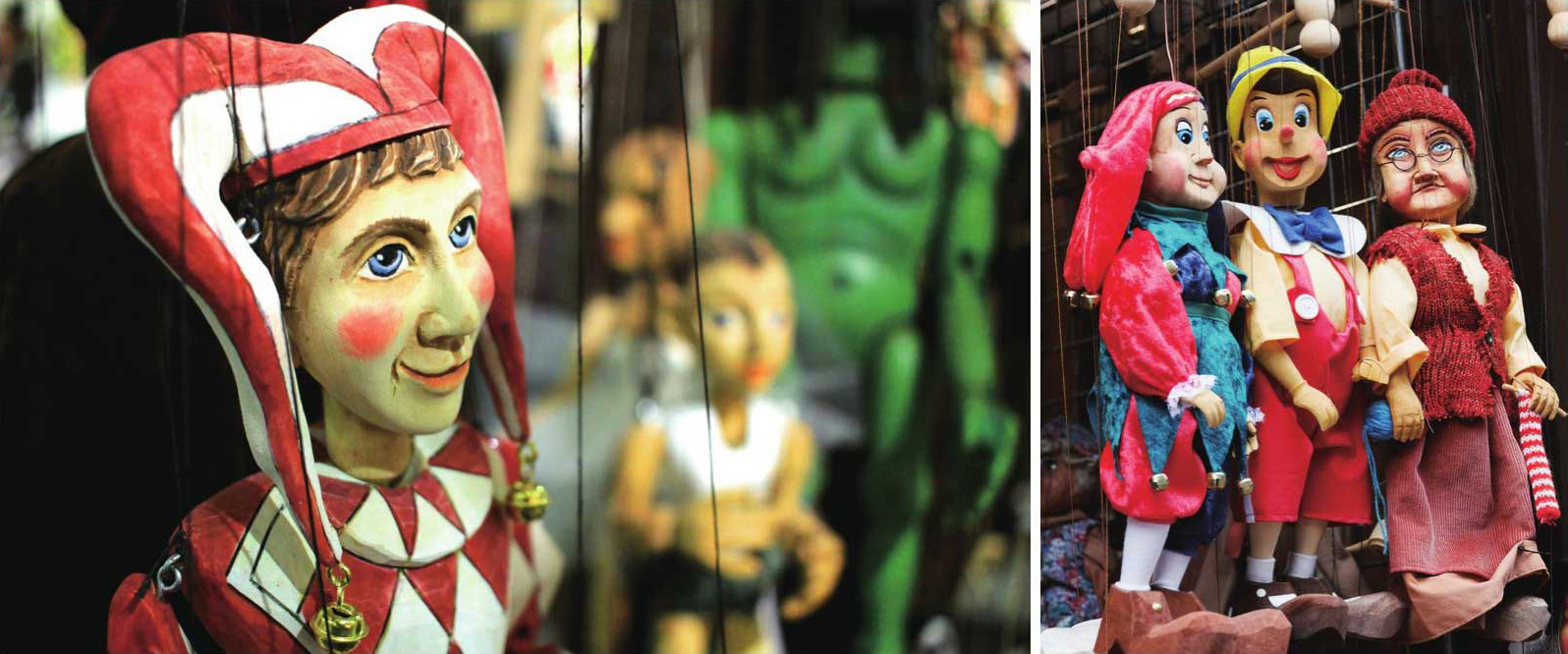 木偶分为多种,有杖头木偶、提线木偶、布袋木偶、皮影木偶等。制作材料过去多为木材,现在则采用布、纸、塑料、树脂等新型材料。木偶戏的表现形式丰富多样,有木偶音乐剧、人偶剧、即兴表演木偶剧、童话面具木偶剧等。布拉格最多的是提线木偶,木偶的四肢和头部被线提起来,这些线最终在木偶头部上方的总控制轴交汇,人们利用这一控制轴操纵木偶。每一个木偶都由5—8条线控制,并不是随便谁都能表演得那样传神!在布拉格,没有人不为这些活灵活现的木偶人心动。也只有在捷克,才能真正感受到木偶戏的瑰丽与神奇。莫扎特曾说:“只要用点心,你会发现木偶的灵魂,不只是在木偶,还有那丰富幽默的肢体语言与顺畅无碍的想象空间。”