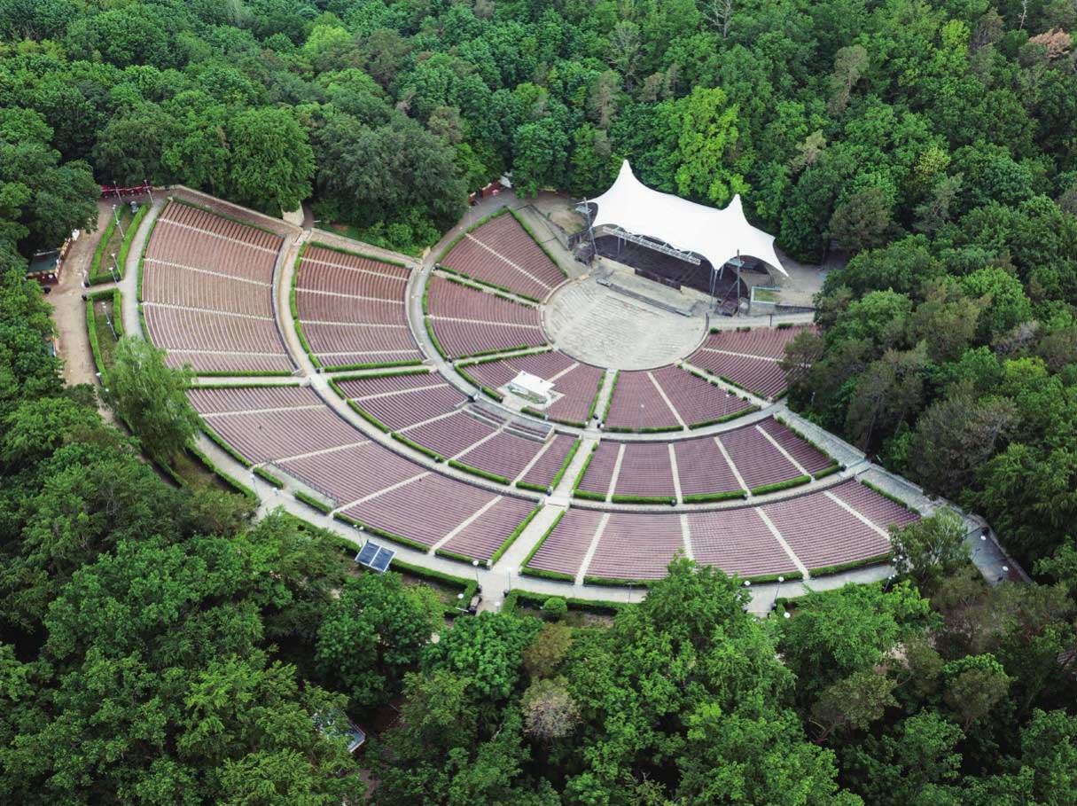 柏林森林音乐会由柏林爱乐乐团于1984年创办,至今已有40年的历史。其间,许多世界著名指挥大师都曾在此登台献艺。柏林森林音乐会演出场地的全称是“瓦尔德尼森林剧场”,这座森林剧场是大自然的造化,也可以说是大自然送给音乐爱好者的一件礼物。该露天剧场的所在地原来是一片森林,但由于自然生态的变迁,此处逐渐形成了一块约30米深的盆地。1935年,有人发现了这块地方,在大胆的创意和艺术性的修整之下,形成了一个可以容纳几万人的露天剧场。最初,它只是供大型宗教仪式和演出之用。1982年,这一露天舞台被装上了一个巨大的白色顶棚,并设有88排环形坐席,可同时容纳约23000名观众就座,加上其周围的自然森林景观,成为一个可以举行大型户外音乐会的理想场地。此后,这里便随着柏林爱乐乐团一年一度的“森林音乐会”而很快名扬世界。此外,在这里举办音乐会,听众不必像到音乐厅那样西装革履、正襟危坐,而是可以非常随意地带上毛毯、野餐盒,或躺或坐在剧场中。当夕阳西下时,一边听着世界上著名乐团的精彩演奏,一边点燃自己带来的小蜡烛,与家人在烛光下共同品尝美酒佳肴,情调格外别致,心情也非常惬意。不仅如此,瓦尔德尼森林中的鸟鸣虫叫和湿润清新的空气更会让听众感到轻松和快乐。