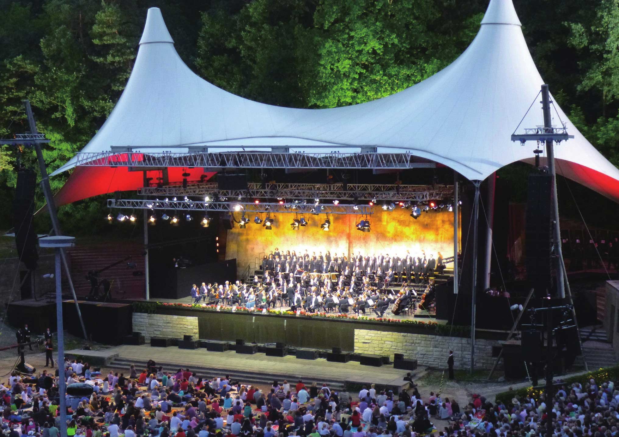 从飞机上鸟瞰柏林,她被茂密的森林以及湖泊、河流环抱,仿佛沉浸在一片绿色的海洋中。柏林拥有全德国最大的城市森林,面积约有29000公顷。柏林森林音乐会,顾名思义,便是在柏林城区的一处森林里建成的露天剧场中所举行的音乐会。