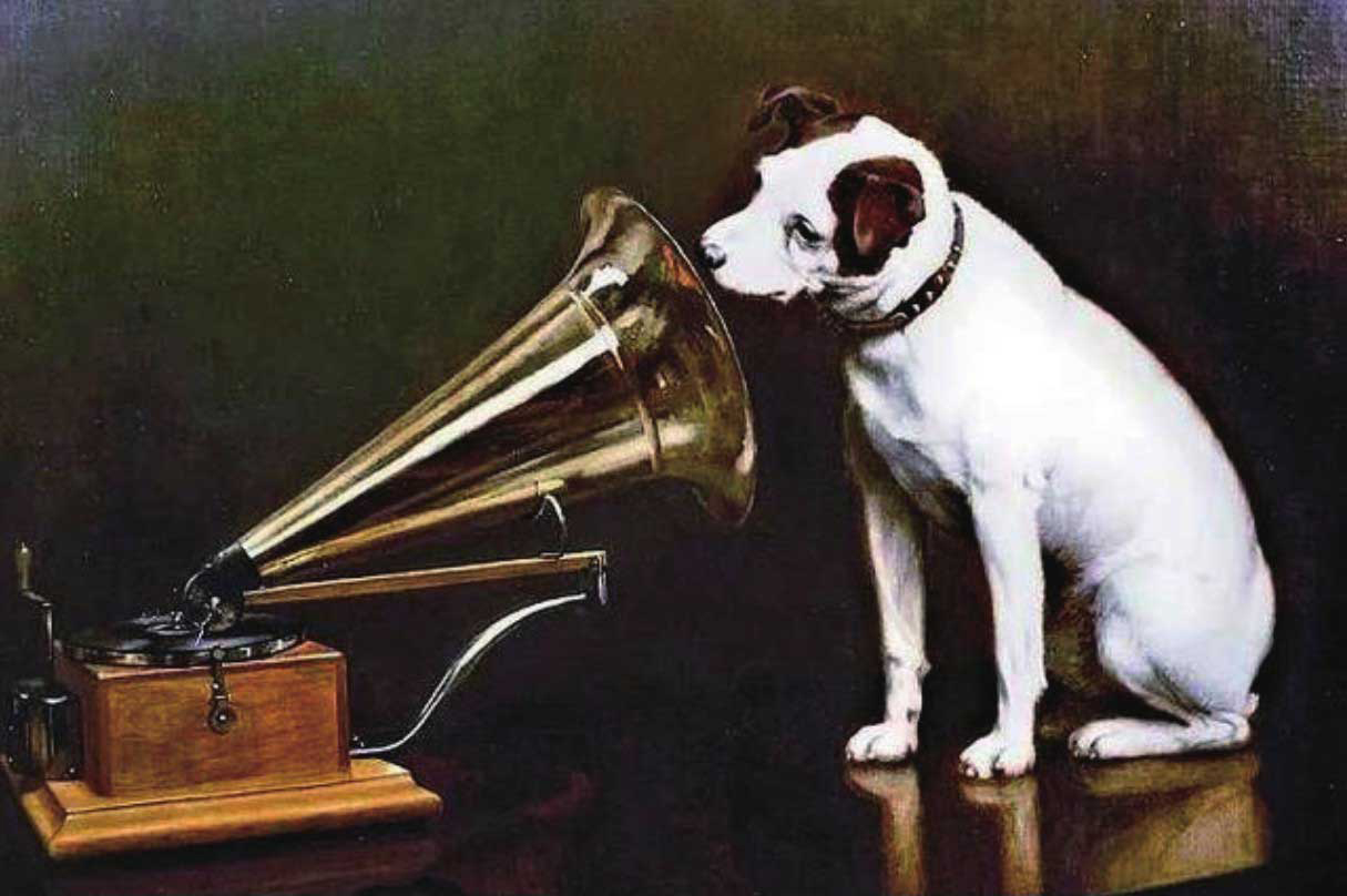 正是由此,EMI唱片公司成为英国的一个文化标识,世界音乐唱片工业的一面旗帜。关于EMI公司商标的来历,还有一个有趣的故事。人们都习惯将这个商标称为“小狗听喇叭”,其实它的真实名字叫“它主人的声音”(His Master's Voice)。1884年,一位名叫马克·波洛的英国设计师,退休后来到伦敦,投靠弟弟弗朗西斯。一个冬日的夜晚,马克在街边发现一只流浪的小狗在寒风中瑟瑟发抖。好心的马克便把这只小狗抱回收养,给它取名为“尼佩尔”。三年后,马克因病去世。葬礼上,悲伤的弟弟弗朗西斯发现小狗尼佩尔不知何时也尾随到了墓地。