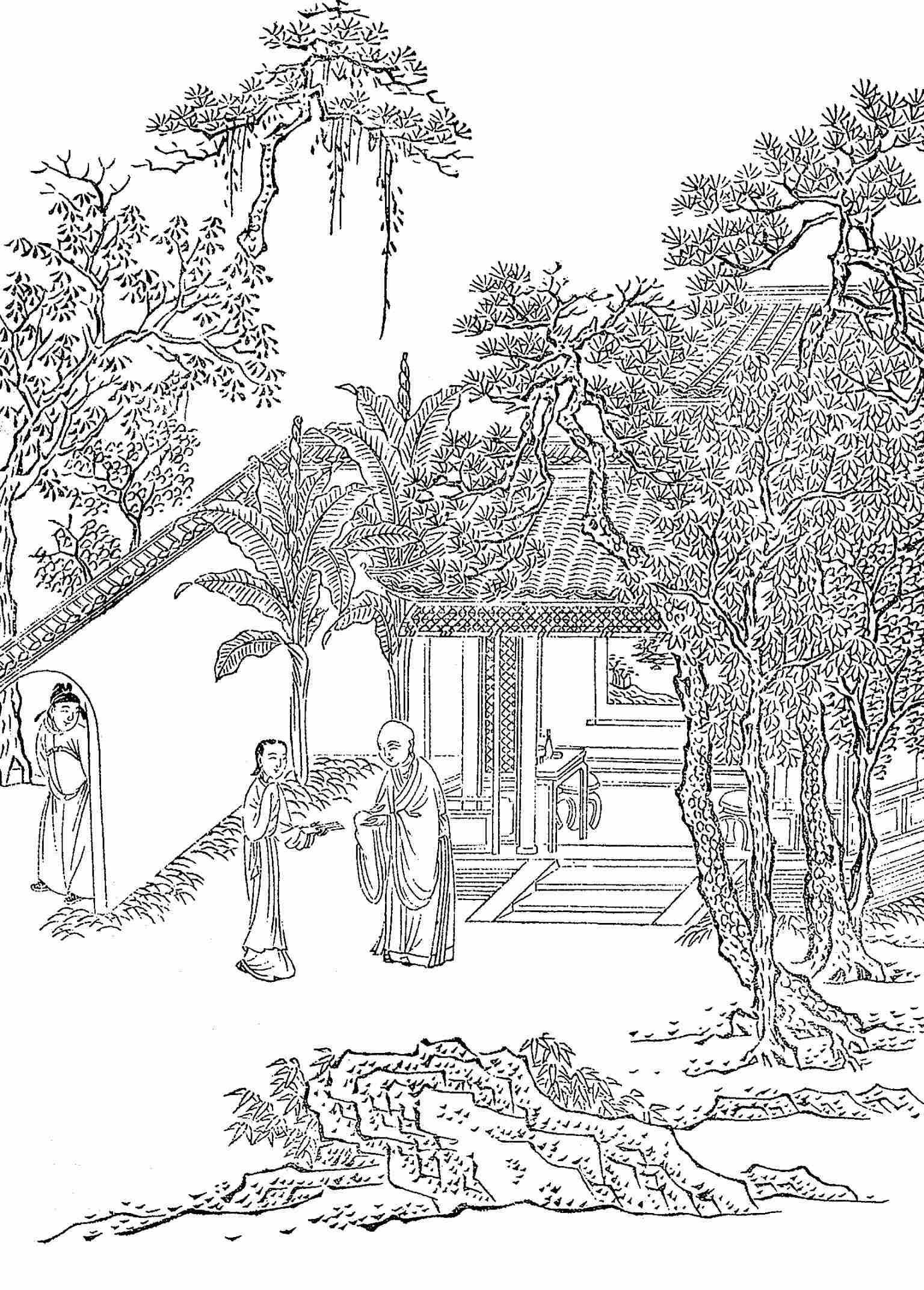 (洁云)二月十五日可与老相公做好事。(红云)妾与长老同去佛殿看了,却回夫人话。(洁云)先生请少坐,老僧同小娘子看一遭便来。(末云)何故却小生?便同行一遭,又且何如?(洁云)便同行。(末云)着小娘子先行,俺近后些。(洁云)一个有道理的秀才。(末云)小生有一句话说敢道么?(洁云)便道不妨。(末唱)