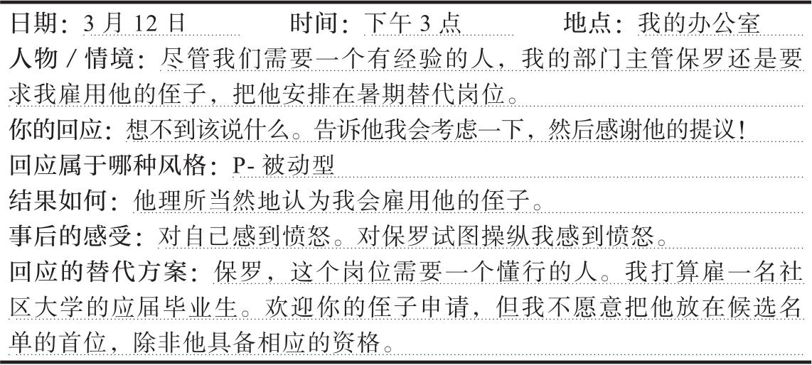 当你使用这些表格时,你会发现你逐渐变得越来越擅长给出坚定自信型的回应。最终,相对更有效的回应会在你需要的时刻及时出现,于是你就能把它们付诸实践。