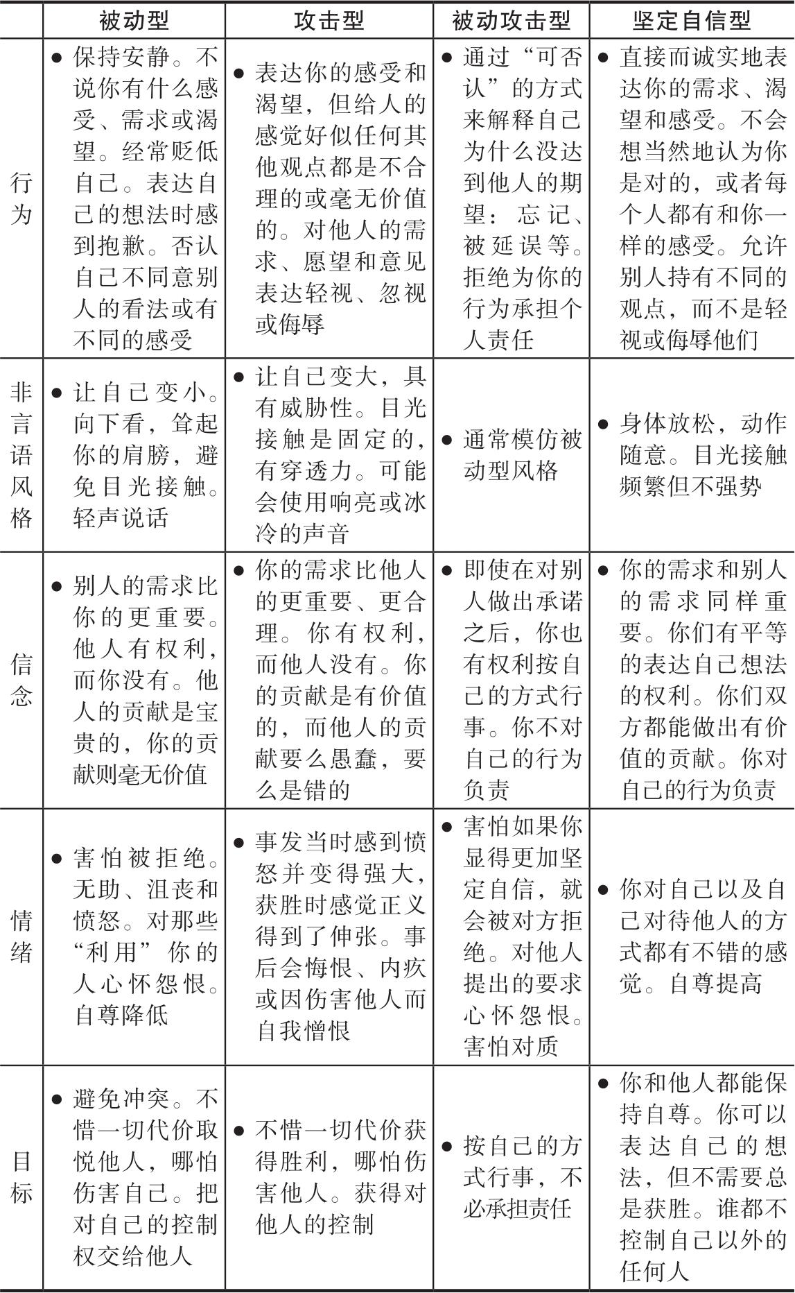 ● 有些人从来没有见过主张自己权利的具体表现。在成长过程中,他们只看到过攻击型或被动型的行为。如果你从未有过主张自己权利的经历,就很难想象它是什么样子的。