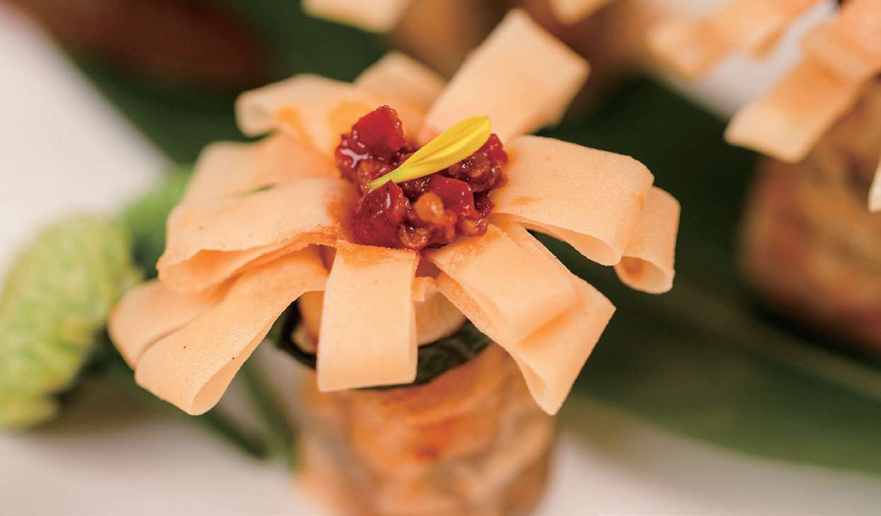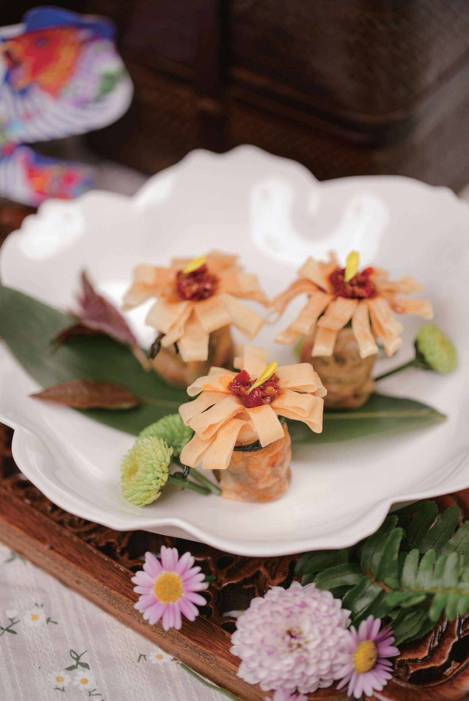 与豆芽清炒,与河虾爆炒等都是家常且美味的做法,但我最喜欢的是韭菜春卷。一番油炸,韭菜的香味被激发出了新的境界,与酥脆的春卷皮一同融合在口腔中,是无论何时想起都要垂涎三尺的风味。今日,再加上一点巧思,韭菜与肉末、虾滑搭配出鲜美的馅料,包裹后将春卷皮一端剪出花瓣,慢慢卷起,用春韭绑紧,温油炸透,再装点少许辣酱。