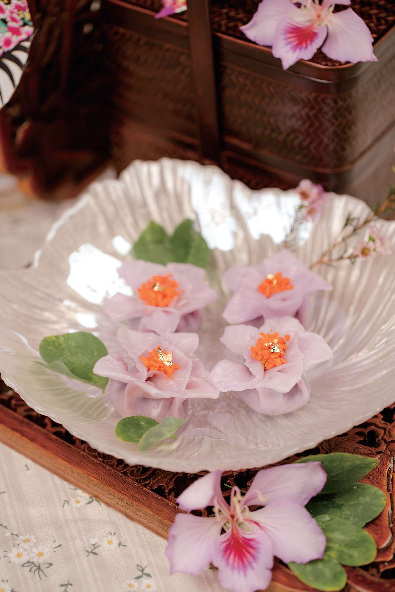 今日结合春景,加一点创意到菜品中。鸡蛋打散,入锅快炒成蛋碎。香椿焯水,过冷水后切碎,与炒好的鸡蛋搅拌均匀,适当调味,馅料即成。紫甘蓝汁在柠檬汁的作用下神奇地化紫为红,趁热加入澄面与土豆淀粉混合的干粉中,调和成柔韧的面皮。擀压包裹,用手指推出皱褶,捏出花型,点缀花心,上锅蒸熟。一朵朵晶莹剔透、色彩梦幻的紫荆花,便迎着暖烟盛放了。