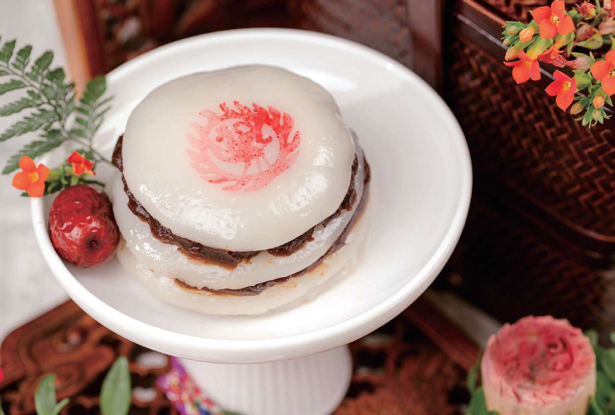 传统的太阳糕一般是以糯米粉加糖和水揉成面团,压成圆饼上锅蒸熟。蒸好的糯米糕之间夹上枣泥馅,五层为一碗,再在顶面用红曲水印上昂首三足金乌像代表太阳神。今日,按照古法制之,还特别定制了一个木模,在顶上压出“金乌圆光”的传统图案。香甜黏糯的动人滋味里,藏着“步步登高”的美好寓意。