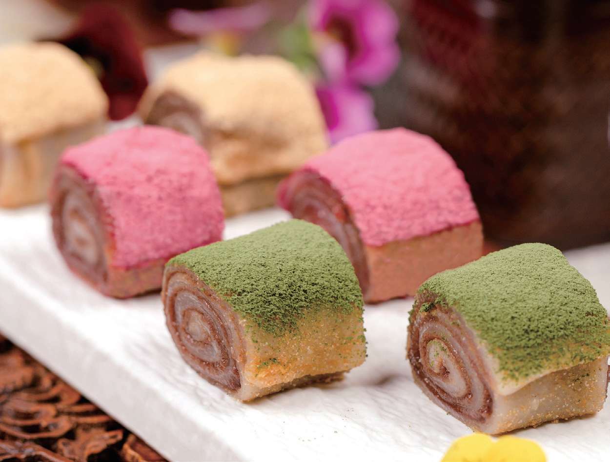传闻已不可考,也有说法称,“驴打滚”上面的黄豆面神似春日野驴在地里欢快打滚时扬起的滚滚黄沙,故而得名。无论真相为何,这道美味小吃都值得在春日里制作享用。蒸好的糯米团粘熟黄豆面擀开,抹上红豆沙,卷起,以棉线分割成块,分别撒上熟黄豆面、抹茶粉、樱桃粉制成三色“驴打滚”,软糯香甜,食之难忘。