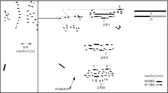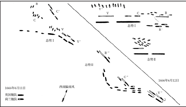 结合整个叙述来看,虽然不能最终确定荷兰舰队的阵位部署,但可以这样大致确定。总的来看,在1666年6月11日的白天,荷兰舰队这样的队形不尽如人意。