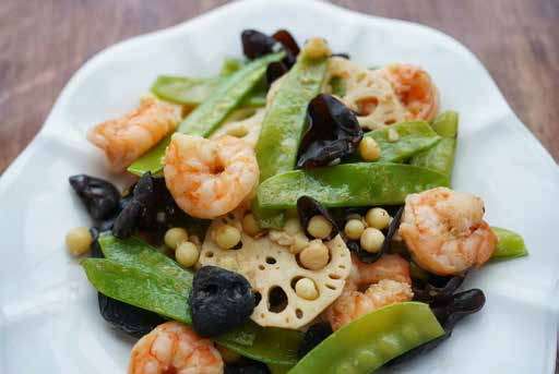 鲜鸡头米(芡实)100克,荷兰豆150克,莲藕100克,虾仁100克,木耳30克,葱、盐、食用油各适量。