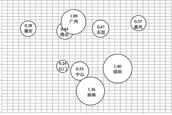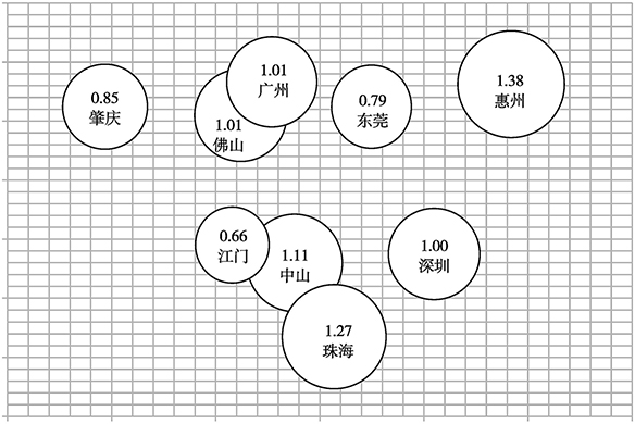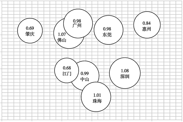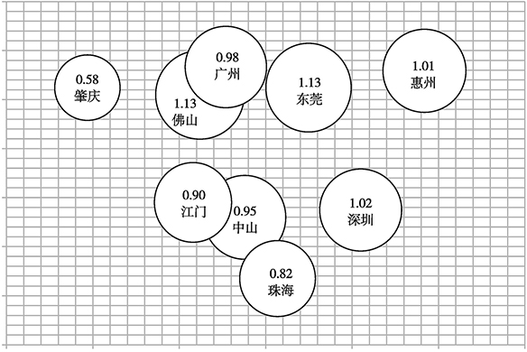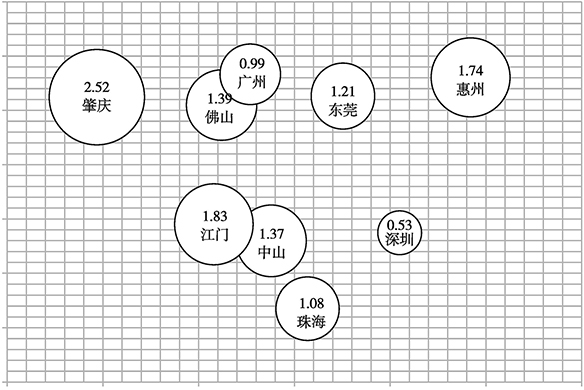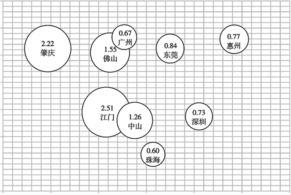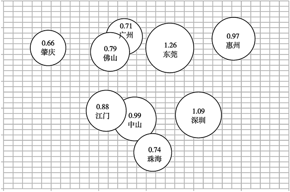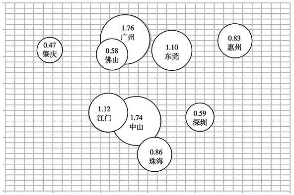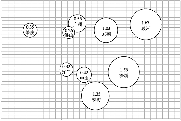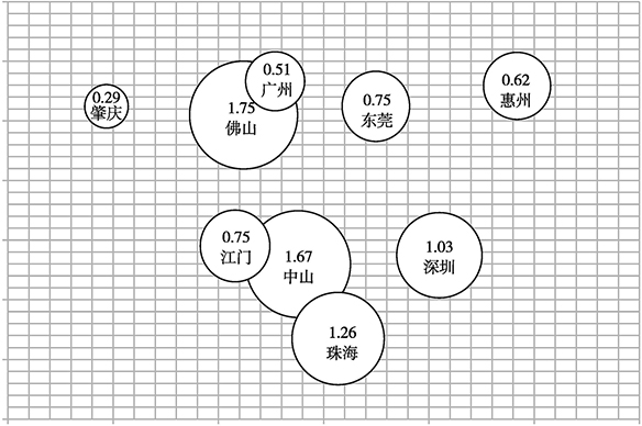 从空间上考察主导制造业在珠三角城市的集中情况有助于判断城市间产业分工的情况。图5至图9是2013年上述五类制造业在各城市的集中情况,集中度指标是行业就业的区位商,圆圈越大表示该行业越集中于某个城市。通过观察各图可以粗略地判断,除橡胶和塑料制造业外,其余制造业在各市的集中度有较大差异。纺织服装、鞋、帽制造业明显集中于广州和中山,金属制品制造业集中于江门和肇庆,电气机械及器材制造业集中在佛山和中山,而通信设备、计算机及其他电子设备制造业以惠州、深圳、珠海为重镇。这意味着珠三角城市之间在制造业细分行业上存在一定程度的水平分工,即各城市侧重制造不同的产品。这可能与多年来广东省政府通过产业政策引导各市差异化发展有关。