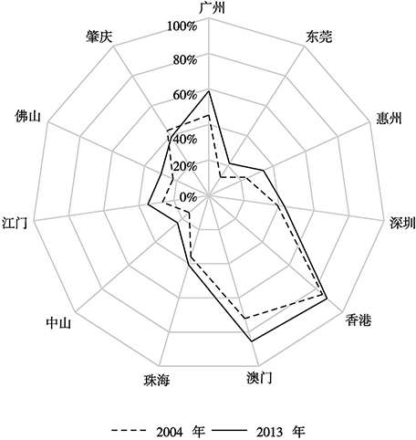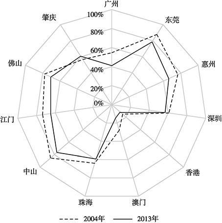 制造业是第二产业的主体,其下有很多细分产业,此处分析制造业19个细分类别的就业占比情况,以考察珠三角城市在制造业内部的专业化分工情况。由于港澳本地的制造业就业份额极小,故此处的分析不包含港澳数据。表3列出了2013年珠三角各市就业占比排名前五位的细分行业,各市前五位行业的就业总和能占到制造业就业总数的48%~69%。数据显示,大部分珠三角城市的制造业就业主要集中在纺织、橡胶、金属、电气、通信五个行业。其中,通信以深圳和惠州为代表,其数字高达36%以上。电气则以佛山和中山为代表,该行业占比超过22%,远高于其他城市。通过2004年与2013年的跨年份比较可以发现,这几大行业在时间上具有稳定性,即大部分城市的主导制造业在十年间变化不大。这表明城市的产业结构对历史路径有较强的依赖性,一旦形成后要改变就比较困难:一是因为城市政府会把它们当作优势产业不断刺激;二是产业成长过程中沉淀了大量专用资产,如厂房、设备、技术、劳动力等,不容易为其他产业所直接使用;三是围绕主导制造业建立的相关产业体系过于庞大,不容易改变。