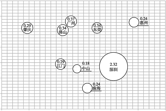 此处使用2013年行业就业区位商来反映各城市服务业的专业化程度。从地理上看(见图10至图12),批发和零售业、房地产业、租赁和商务服务业的分布比较均匀,没有哪个城市表现得非常突出,说明这三个行业的城市间分工并不明显。由于公共管理行业属于公共部门而非市场部门,其就业并不是由市场供求关系直接决定,因此这里不考虑比较。教育行业表现出在肇庆、江门和惠州等城市集中(见图13),但这并不意味着它们是教育中心,其中的原因与上文的解释相近。有两个非主导行业表现出较强的城市间分工,即金融业与信息传输、软件和信息技术服务业(见图14、图15)。深圳毫无疑问承担了珠三角金融中心的角色,而深圳、珠海、广州则扮演着信息技术服务中心的角色。