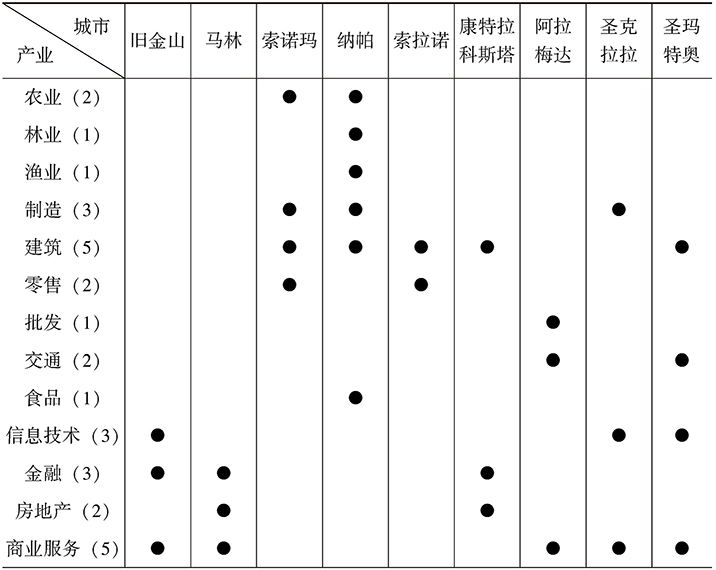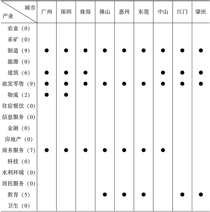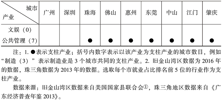 以旧金山湾区为例,表5显示,其内部9县的支柱产业分布有较大差异,除了建筑、商业服务、教育三个行业是4~5个城市的共同支柱产业外,其余大部分支柱产业仅分布在1~3个城市中,体现了高度的城市产业分工关系。与之形成鲜明对比的是,制造业是所有珠三角城市的支柱产业(见表6),而在制造业细分行业中,超过一半的城市又都集中于服装鞋帽、橡胶塑料、金属制品、电气机械、通信设备的生产(数据见“粤港澳大湾区产业结构现状”一节的相关部分)。建筑业也是大部分城市的支柱产业之一。第三产业亦是如此,批发零售、商务服务、公共管理三个行业的就业量之和占据了各个城市10%~30%的就业量。由此看来,粤港澳大湾区城市间的产业分工体系与世界级湾区还有很大的差距。