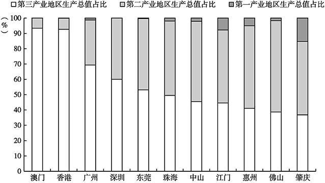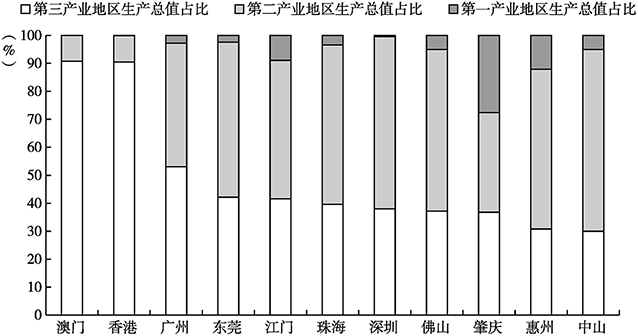 图3 大湾区各市(特区)地区生产总值的产业构成(2004年)