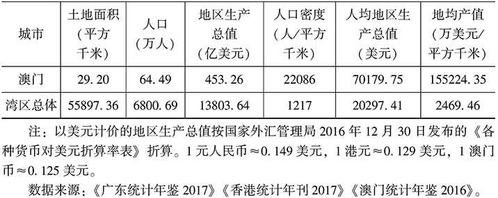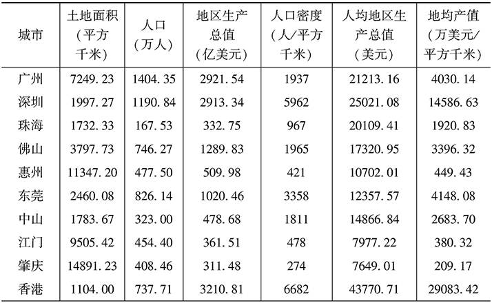 粤港澳大湾区是传统珠三角概念的扩展,其重要内涵在于将港澳亦纳入珠三角的一体化进程中来,包括九个珠三角城市和香港、澳门两个特别行政区。建设粤港澳大湾区是一项国家级战略,其根本目的在于提高该区域的生产力水平,使之成为国家经济的重要支柱和引擎,引领和带动整个国家的发展,并参与全球竞争。2016年粤港澳大湾区经济概况见表1。
