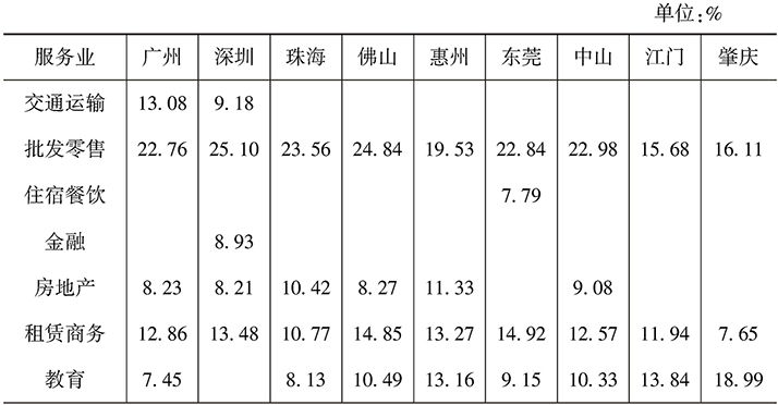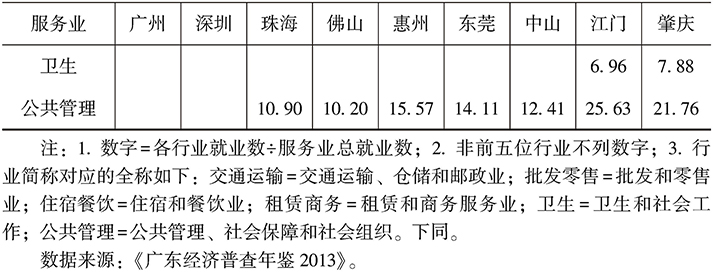 表4 珠三角各市就业占比排名前五位的细分服务业(2013年)