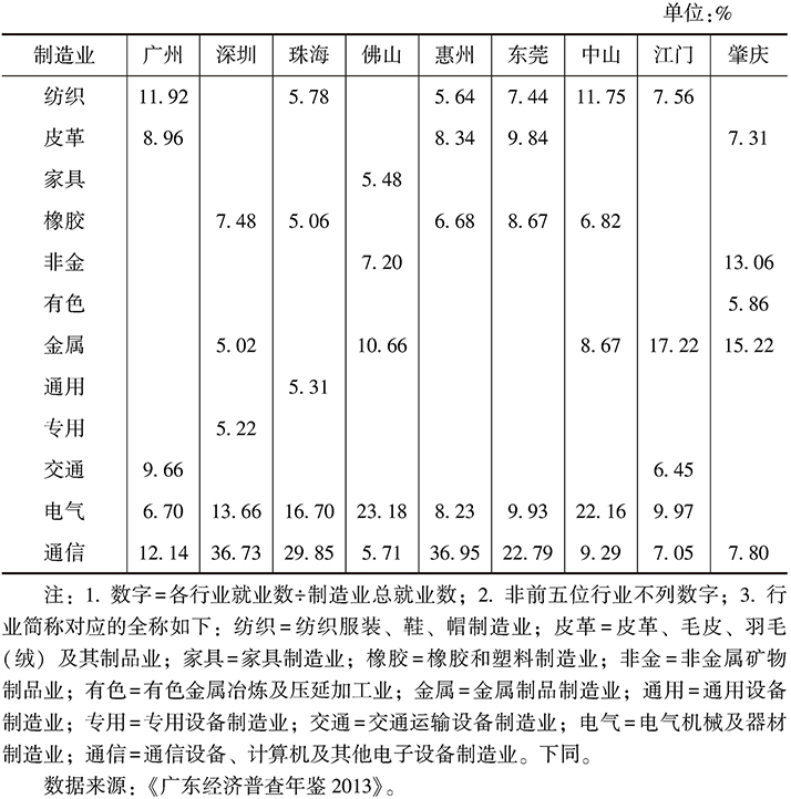 表3 珠三角城市就业占比排名前五位的细分制造业(2013年)
