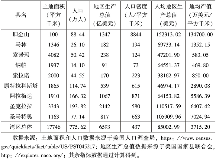 世界上有几大公认的发达湾区,如纽约湾区、旧金山湾区和东京湾区,它们是粤港澳大湾区比照的标杆。这里以旧金山湾区为例,将其基本经济概况与粤港澳大湾区相比较,考察两者之间的差距所在。旧金山湾区位于美国西海岸的加利福尼亚州北部,通常分为东湾、北湾、半岛和南湾四大片区,涵盖了9个县(county)、101个市(city),土地面积共计约1.77万平方千米,人口超过775万(见表2)。旧金山湾区以环境优美、科技发达著称,经济实力雄厚。2016年旧金山湾区地区生产总值达到6593亿美元,若将其视为一个“国家”,经济总量可居世界第18位,领先于荷兰、瑞士和瑞典等欧洲传统经济强国。